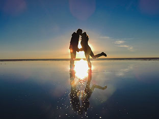Parada no meio do deserto de sal no meio da travessia de retorno do povoado de Colchani para a cidade de Uyuni. Tempo para passeios ao redor do imenso Salar e observação dopôrdo sol lento,pôr do sol com tempo para fotografias. Oferecem-se snacks aos participantes ou champanhe (a pedido).